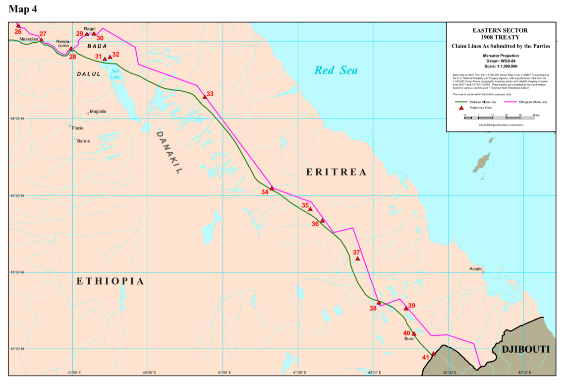 In establishing the eastern terminus of the Central Sector at Point 31 at the northern edge of the Salt Lake, rather than at Rendacoma (point 28), the Commission had already decided the western terminus of the Eastern Sector. The Commission first resolved the method of drawing the inland line running parallel to the coast and determined the location of the eastern terminus atop Mount Mussa Ali. It then essentially confirmed the Treaty line with the proviso that it passes at a point, lying equidistant between the Eritrean and Ethiopian checkpoints, at Bure (Point 40) to the border with Djibouti (Point 41), as shown in Map 5.[13]