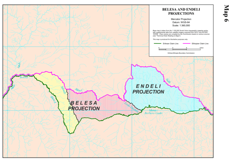 Map 6 shows the territorial consequence of the Boundary Commission’s modification of the 1900 Treaty line in the Central Sector for Eritrea and Ethiopia. The heavily shaded patches of territory in the western part of the Belesa Projection, around Zalambesa, in the eastern and southern parts of the Indeli Projection (Irob) and the Bada region, signify areas awarded to Ethiopia by the decision of the Eritrea-Ethiopia Boundary Commission.